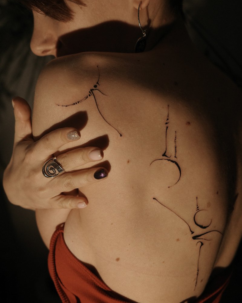 Minimalist abstract linework tattoo on shoulder and back with delicate curves and dots