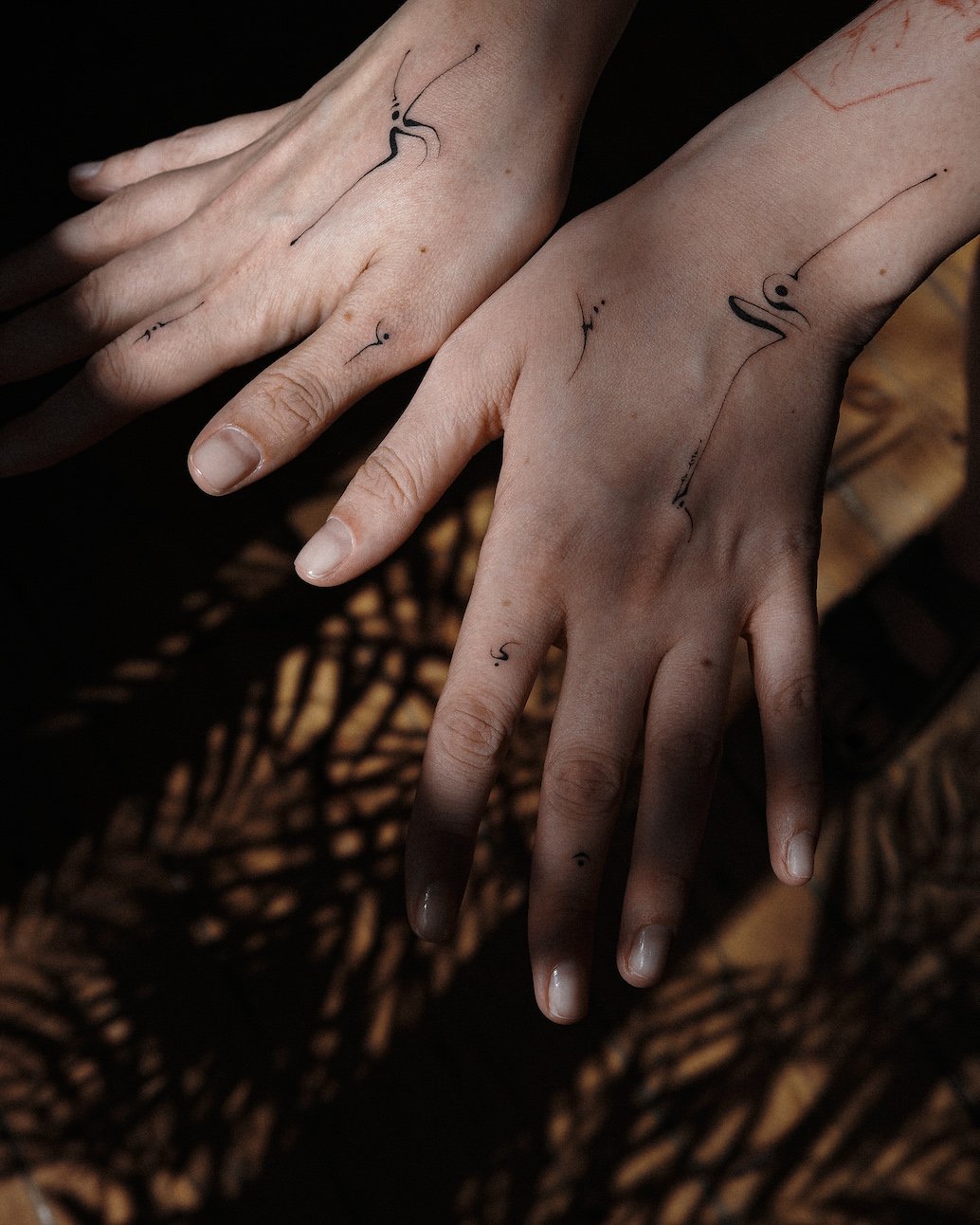 Minimalist abstract fine line tattoos on hands and fingers with elegant flowing curves