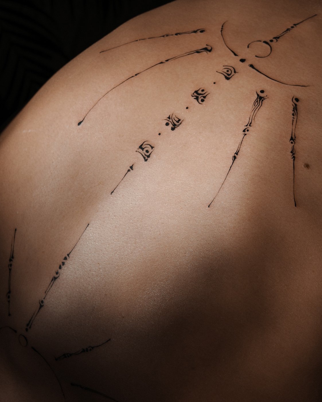 Macro detail of a fine line ornamental back tattoo for women, featuring precise black ink sacred geometry and spiritual symbols at Names Tattoo Studio in Lisbon