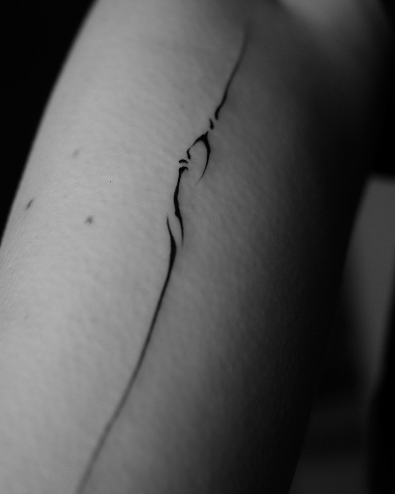 Minimalist abstract fine-line tattoo on skin featuring a vertical sigil-like composition with delicate curved lines and symbolic calligraphic elements at Names Tattoo Studio in Lisbon