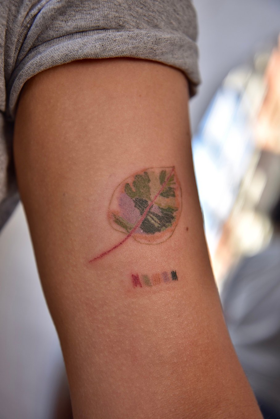 Pointillism Ficus elastica leaf tattoo with pink and green tones on inner arm at Names Tattoo Studio in Lisbon