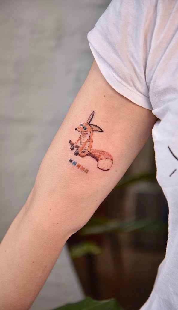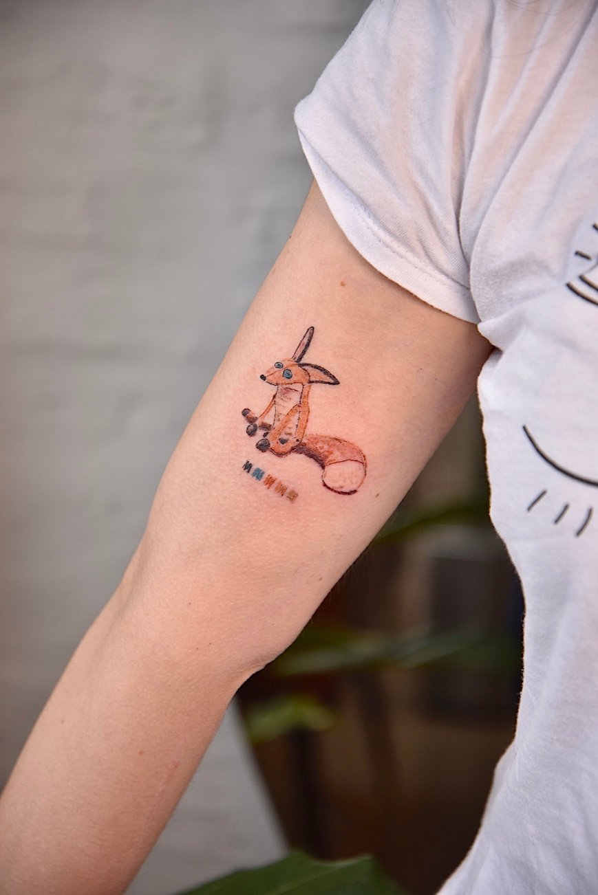 Micro color realism fox illustration tattoo on inner arm by Names Tattoo Studio in Lisbon