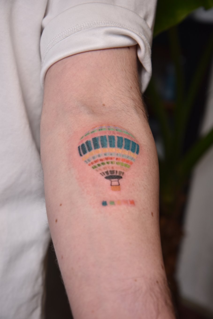 Colorful pointillism hot air balloon tattoo on inner arm at Names Tattoo Studio in Lisbon