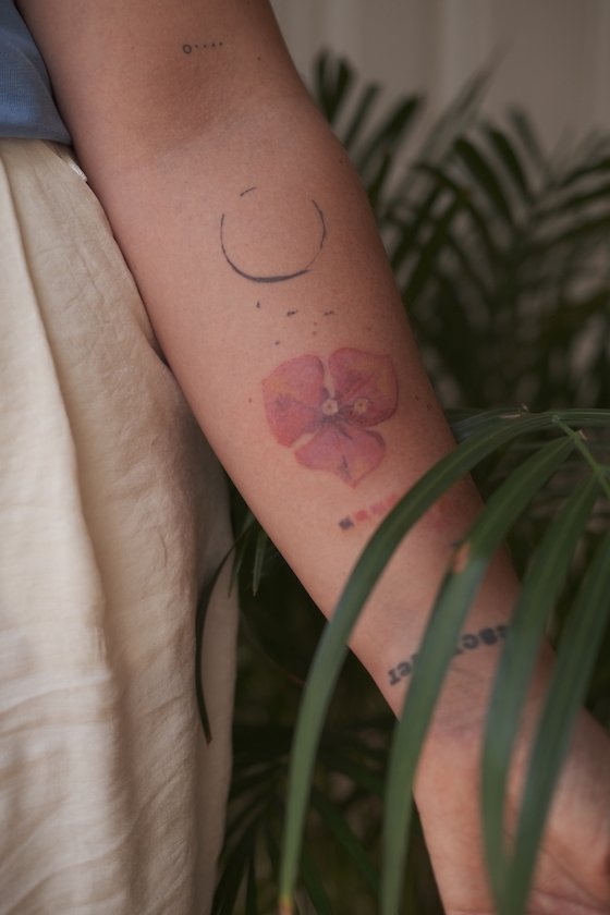 Minimalist watercolor pink flower tattoo on forearm with fine line moon and dotwork details