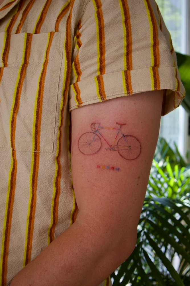 Micro color realism bicycle tattoo with thin red and blue lines on inner arm at Names Tattoo Studio in Lisbon