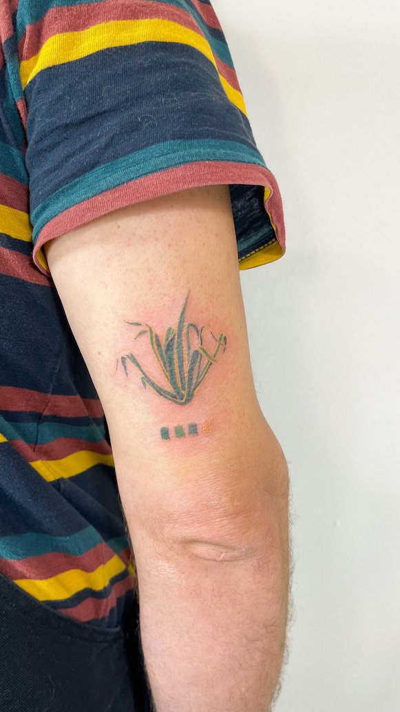 Micro color realism agave plant tattoo with green and yellow tones on upper arm