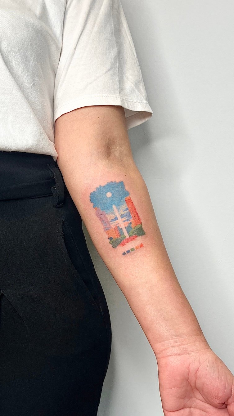 Vibrant oil painting style city landscape tattoo with moon and sky on forearm