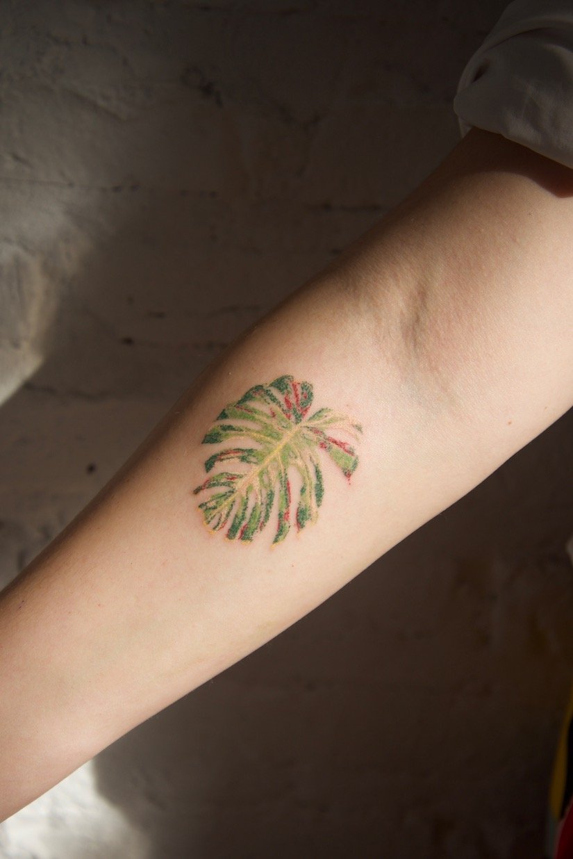 Micro color realism Monstera leaf tattoo with green and red variegation on inner forearm