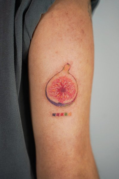 Micro color realism half-cut fig tattoo with pink and purple interior on upper arm